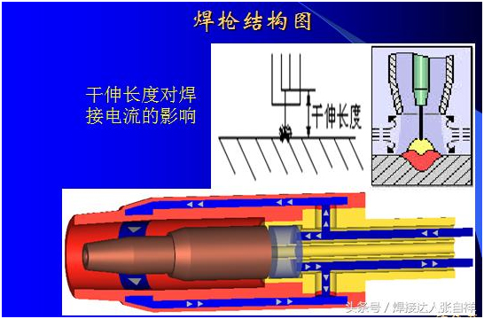氣保焊的構(gòu)造如上圖所示,在焊接過程中干伸長度的計(jì)算是從導(dǎo)電嘴到工件的距離,而不是從噴嘴到工件的距離,根據(jù)電流的大小,干伸長短也有不同的要求,如超出規(guī)范會(huì)影響焊接的穩(wěn)定性和焊接質(zhì)量。