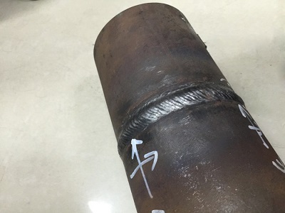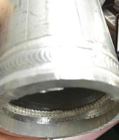 第二模塊鋁合金構建中鋁管的焊接難點主要在于背部融透(如圖6)和內在質量的保證。背部融透主要是考驗選手對熔池的理解,在組對焊縫0間隙的情況下,如何能夠識別熔池溫度是否達到,送遞焊絲時間的選擇,這些都至關重要,而且在焊接過程中,由于鋁合金的導熱系數大,焊接過程中隨著溫度的上升,焊接速度也會越來越快,如果手法跟不上,只是依靠小電流慢速焊,這樣就會在某一點(比如引弧處)不停的加熱,局部時間加熱久了焊縫內部會很容易出現過熱裂紋,焊縫表面發白無光澤,所以鋁合金焊接一般要求大電流快速焊接,也是為了在引弧初期就能夠快速打開鋁合金表面的Al2O3薄膜。該薄膜熔點高達2050℃,極大地超出了鋁的熔點(660℃),由于這層薄膜的保護,所以鋁不易產生腐蝕,但在焊接時,Al2O3會阻礙熔池金屬良好結合,容易形成夾渣氣孔等缺陷,可以說是焊接的障礙,所以在鋁合金焊接中要想達到探傷一級確實很難。一般要先進行酸堿水清洗或機械清理等前期處理。還要保證干燥不潮濕的情況下焊接才能夠保證質量,當然對于選手的焊接操作技能也是首選。這次參賽的65名選手中,該項射線探傷滿分40分的情況下只有一人滿分,30分以上的有7人,內在質量不得分的占多數。這與鋁合金焊接普及面較窄也有關系。隨著這項賽事的不斷進展。我想在不久將來大家一定會攻克難關,充分掌握好這門技術。