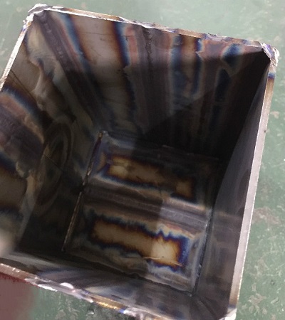 對于第三模塊中不銹鋼結構件的焊接,個人觀點是其焊接難點要更甚于鋁合金的焊接。眾所周知不銹鋼在高溫狀態下非常容易氧化,而且變形量也較大。這次的不銹鋼結構件組對完畢后,所有焊縫根據要求都不允許留間隙、開坡口焊接,并在背部充氣的情況下實現單面焊雙面成型(如圖7),它的焊接難點之一首先是為防止變形,如何選擇好組對之后的焊接順序,其次是焊接過程中如何能夠保證一次焊接背部成型和表面焊縫成型不氧化,乍聽起來好像這兩點有些矛盾,首先要想保證在不留間隙的情況向背面焊透,就要使熔池的溫度充分達到,而熔池溫度一旦過高焊縫表面就很容易氧化發黑,本屆比賽各路選手也是各顯其能,對于氬弧焊噴嘴的使用從6號嘴到10號甚至更大都有使用。其實從理論上來講,要想使氬弧焊接不銹鋼表面成型好,顏色好,主要就是氣體的保護效果,如果比賽允許使用氬氣保護拖罩進行三重保護,即熱影響區也保護起來,那么焊縫達到銀白色的金屬光澤也是有可能的,但這次只允許兩重保護(即內充氣和氬弧槍本身氣體),那么對于焊縫的正表面只能采取大口徑噴嘴進行,才能擴大保護范圍,如果條件允許,也可以采用噴嘴內裝有濾網的大口徑噴嘴進行焊接,這樣的氣體保護會更均勻。但前提是采用大噴嘴口徑的焊槍對焊接過程中選手對熔池觀察的視線會有所影響,也要逐漸適應。這次大賽對于大噴嘴的使用只有少數單位想到了這一點。隨著本次大賽的結束,我想以后對于不銹鋼焊接的氧化問題,會有更多的單位熟悉、掌握,甚至想出更好的辦法來解決不銹鋼焊接氧化的問題。