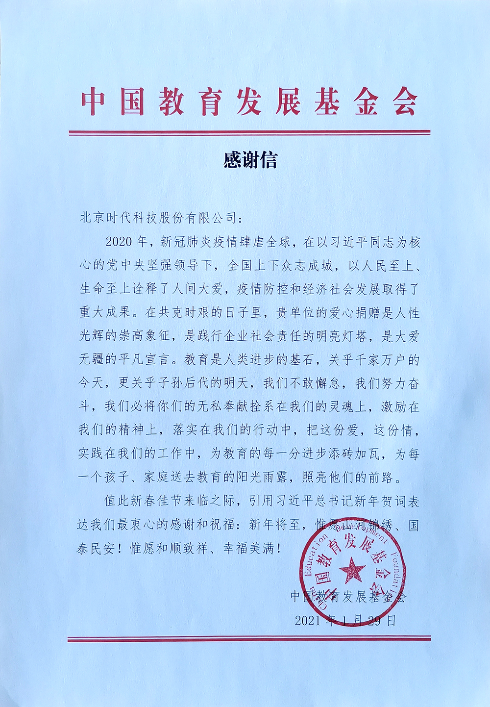 | 2021-02 | 感謝信 | 中國教育發展基金會 |