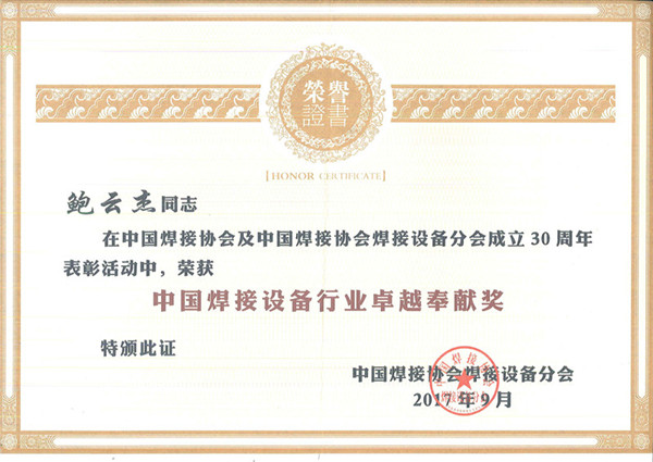 | 2017-09 | 中國焊接設備行業卓越奉獻獎 | 中國焊接協會焊接設備分會 |
